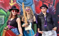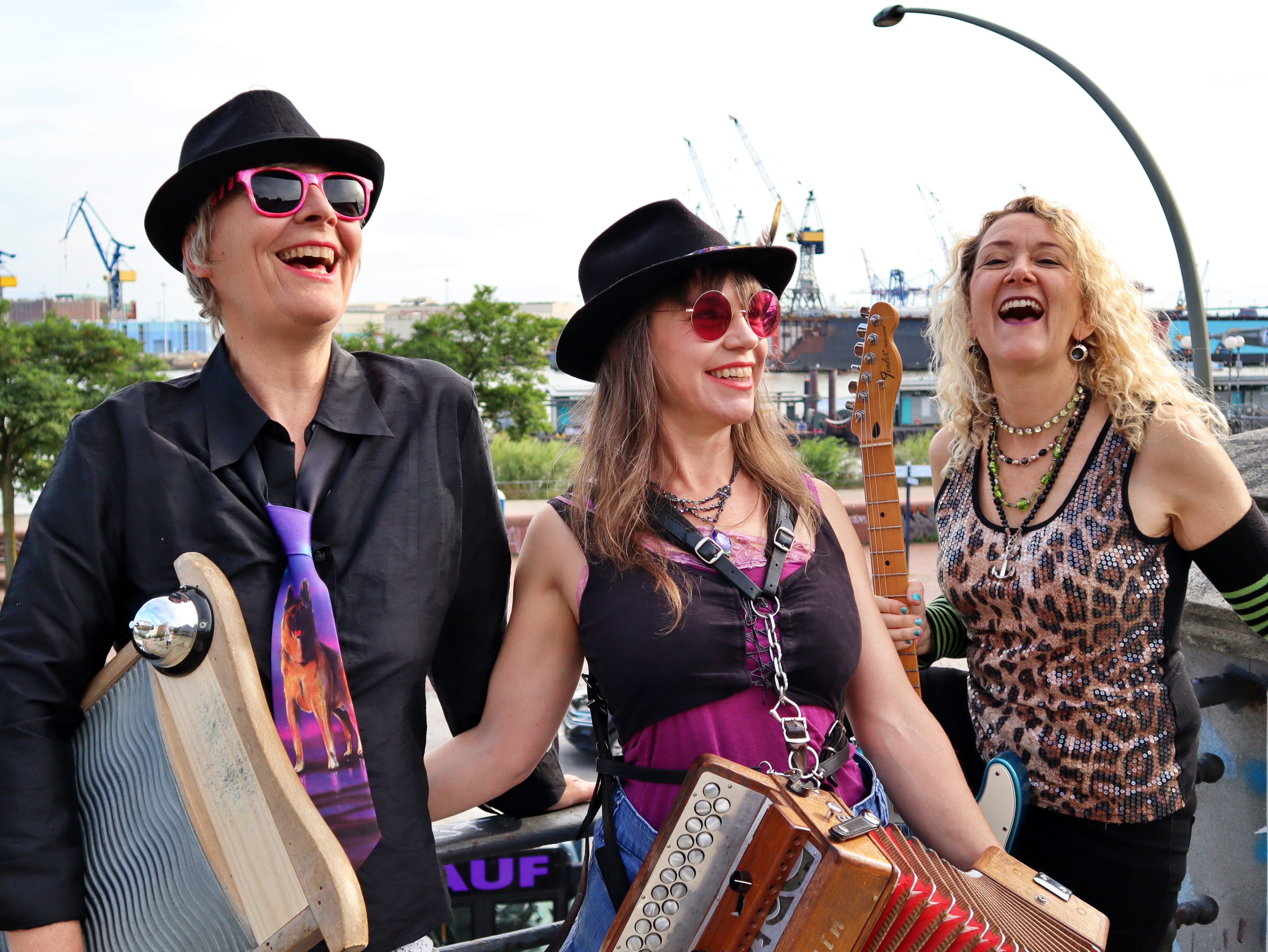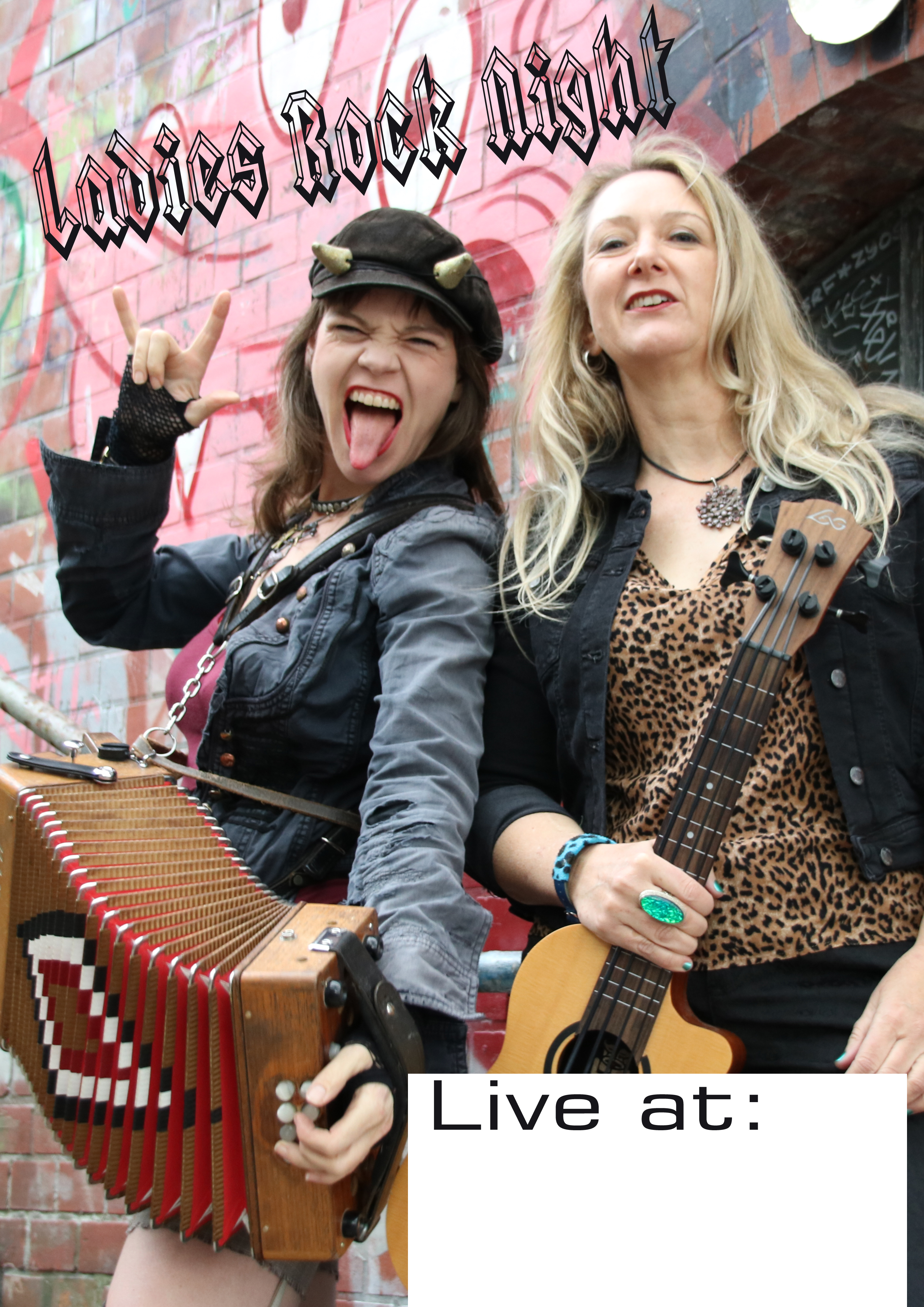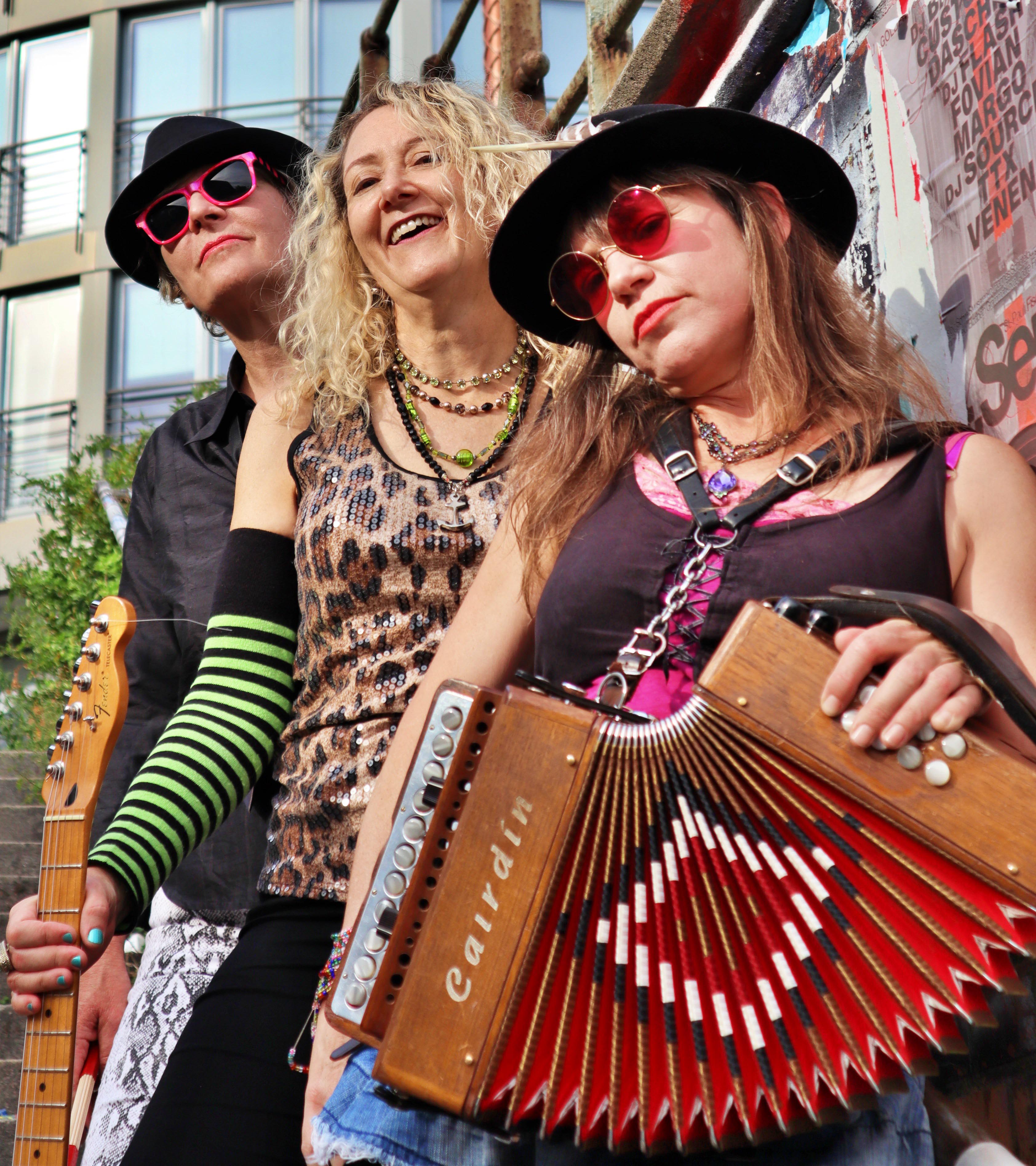 Three lady musicians from two continents. One goal: to rock the party. Ladies Rock Night is a crazy trio who will play just about anything on accordion, guitar, stomp box, and ukuleles and percussion: American roots music, Cajun grooves, and good ole rock 'n' roll. Ginger and Renée met for the first time playing music on the streets of Hamburg, Germany, where percussionist Maike made the band complete. United by their love of busking and trashy 80s music, they joined forces to get the rock party on the roll and get everyone out on the dance floor.
